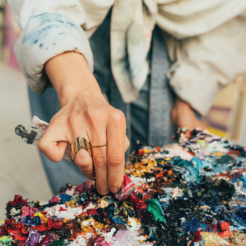 My artworks are produced using acrylics and oils, adding energy and dimension to each piece by creating interesting surface textures through layering, rubbing back, varying weights of application, visible brush strokes and the use of mixed media.
