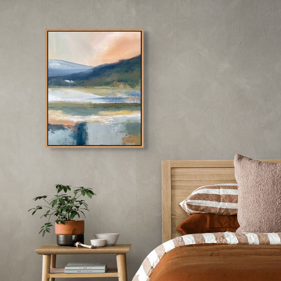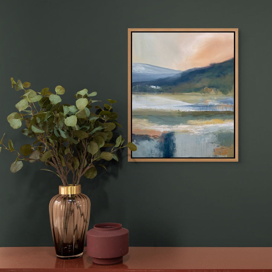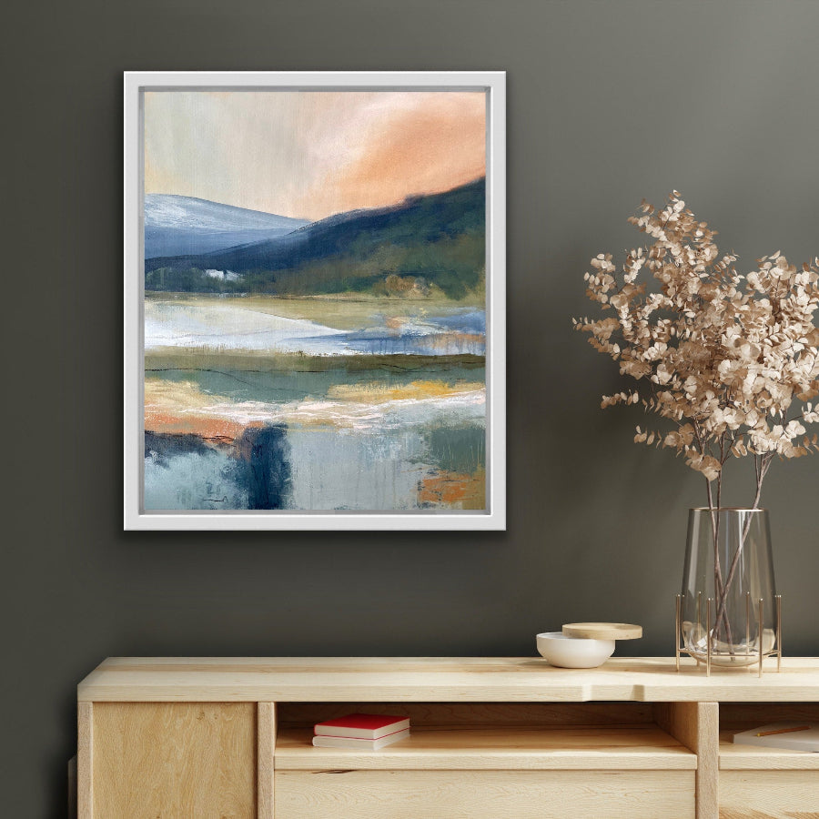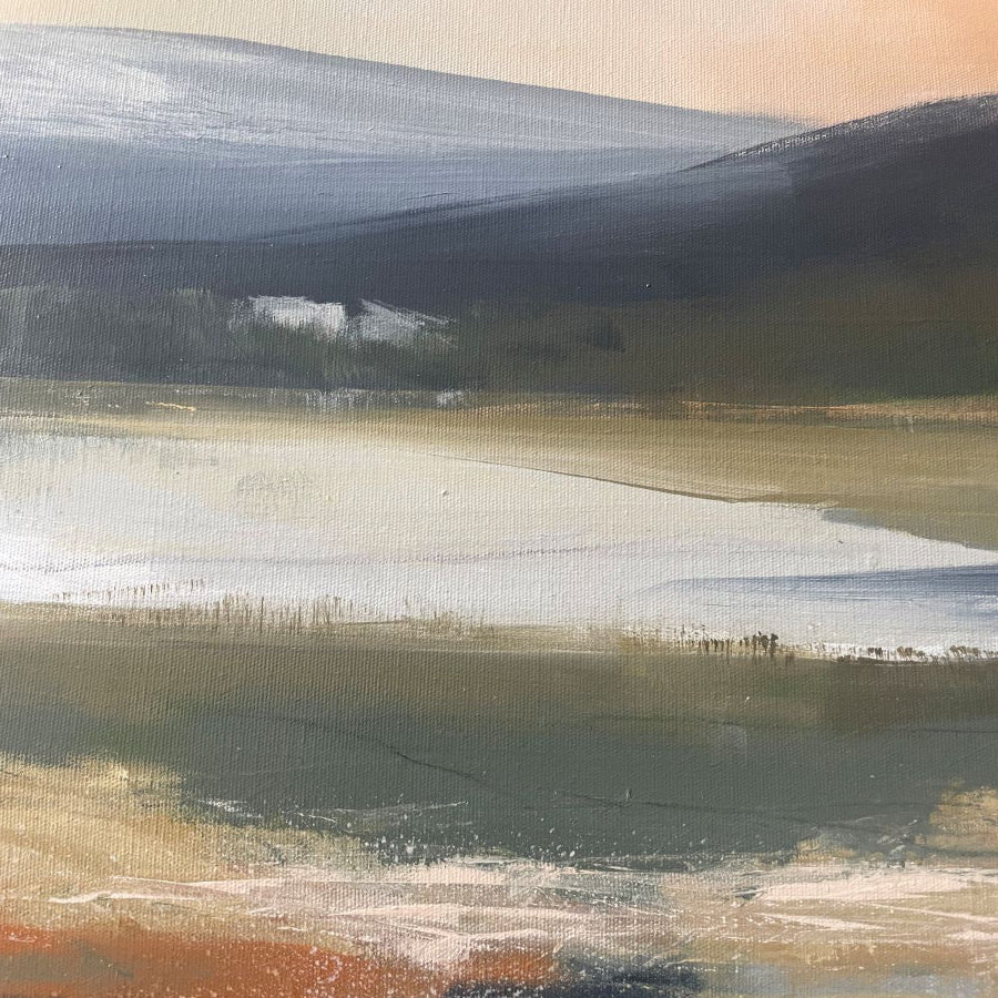 Layers of soft sage, olive green, pale ochre and muted blue drift into warm apricot skies. A subtle palette inspired by moorland and coastal edges. There are delicate glimmers of light throughout, suggesting still water and wide open space.