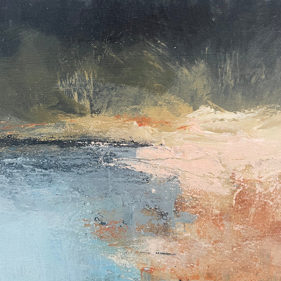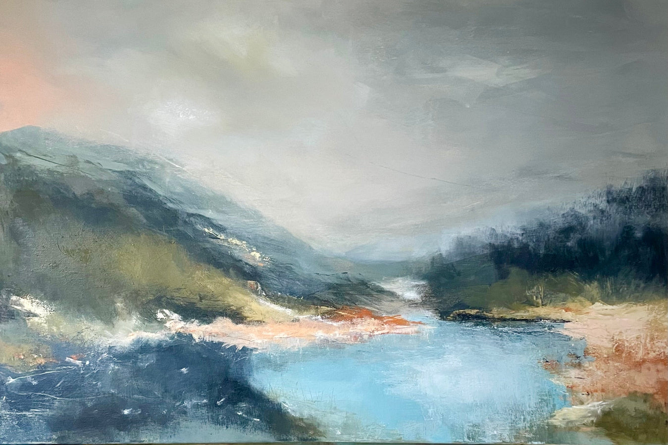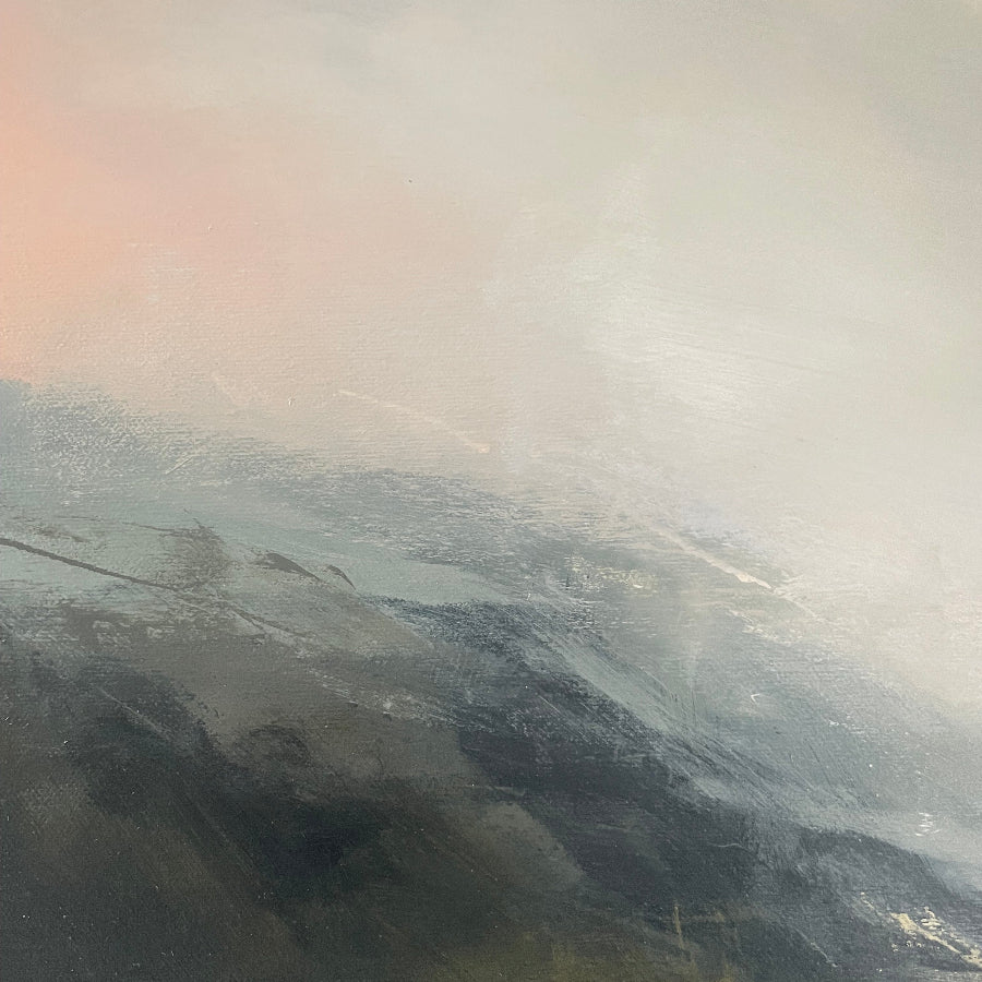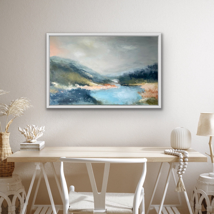 A quiet stillness inviting you to breathe a little slower, with gentle layers of sage, soft blue, and warm earth tones. A memory of somewhere peaceful and untouched. It’s a painting about returning: to yourself, to nature, to that feeling of grounded calm. A timeless piece that works beautifully in minimal or neutral interiors to add a focus to a room.