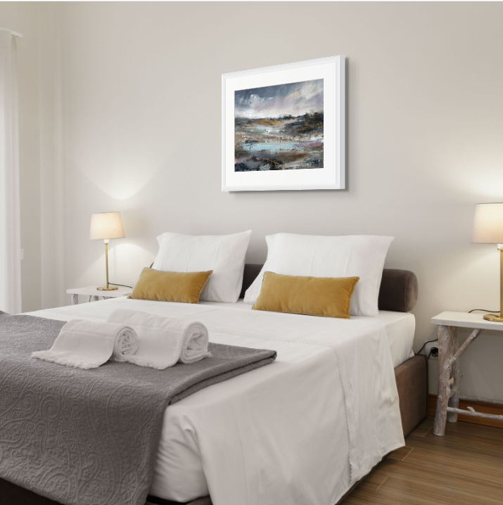 Muted tones of earth, sky, and water blend effortlessly, with soft washes of slate grey, misty blue, and warm ochre layered over deeper charcoal and hints of heather.