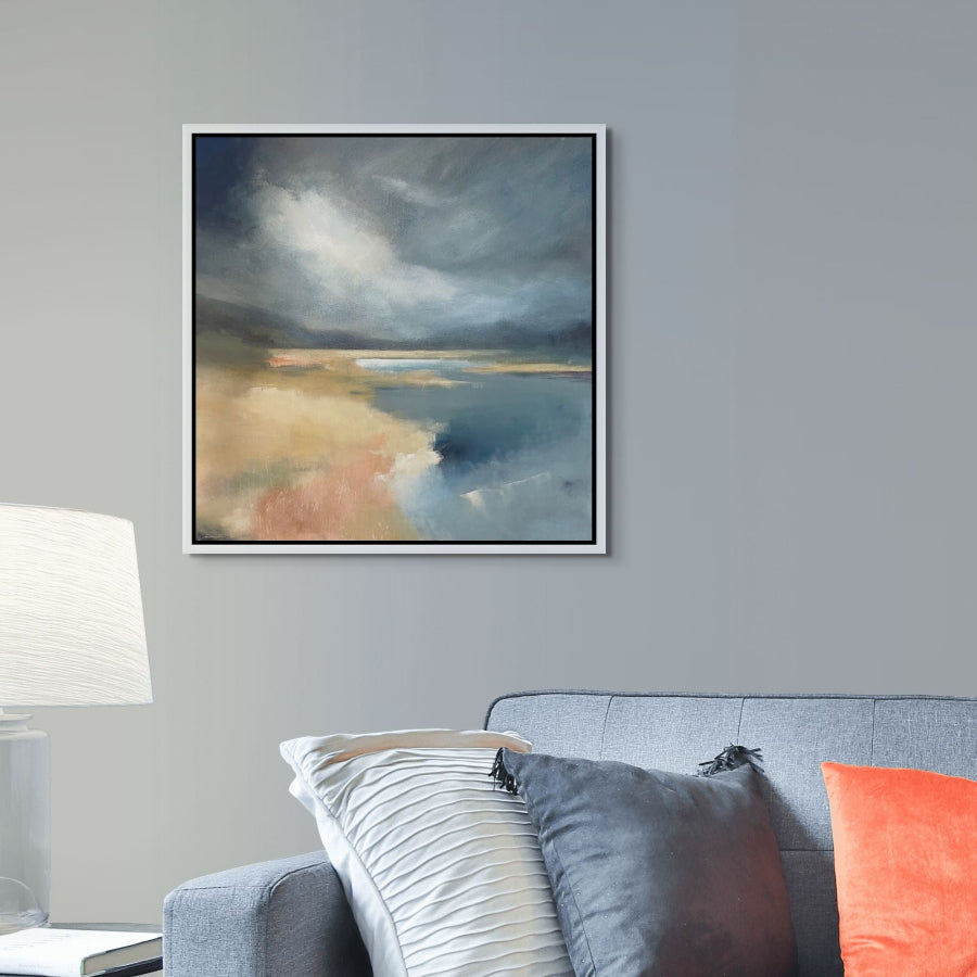 The feeling of light slowly breaking through heavy skies. Something soft and steady emerging after a storm. Gentle ochres, blush pinks, and deep blues flow together, grounded by the drama of a moody sky.
