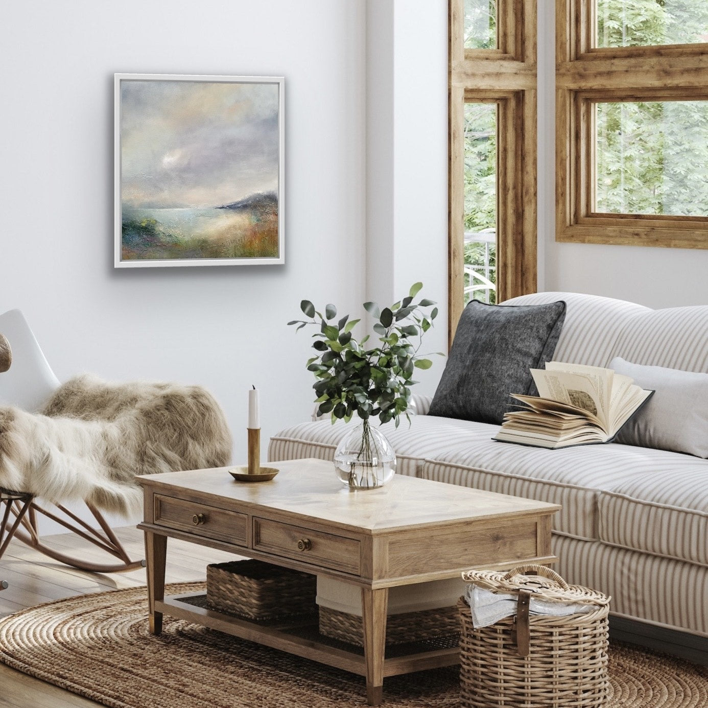This piece with it's etheral light, muted blues, soft greens and hints of earthy tones evokes a sense of calm and introspection.